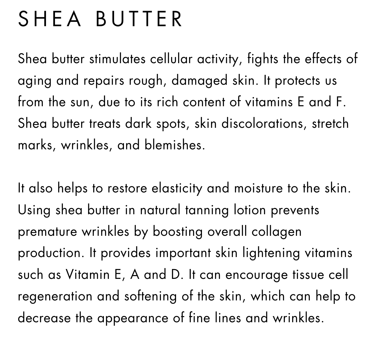 * Organic Shea Butter: Packed with vitamins, this anti-aging boost helps to restore elasticity & moisture to the skin and helps to prevent premature wrinkles by boosting collagen production.