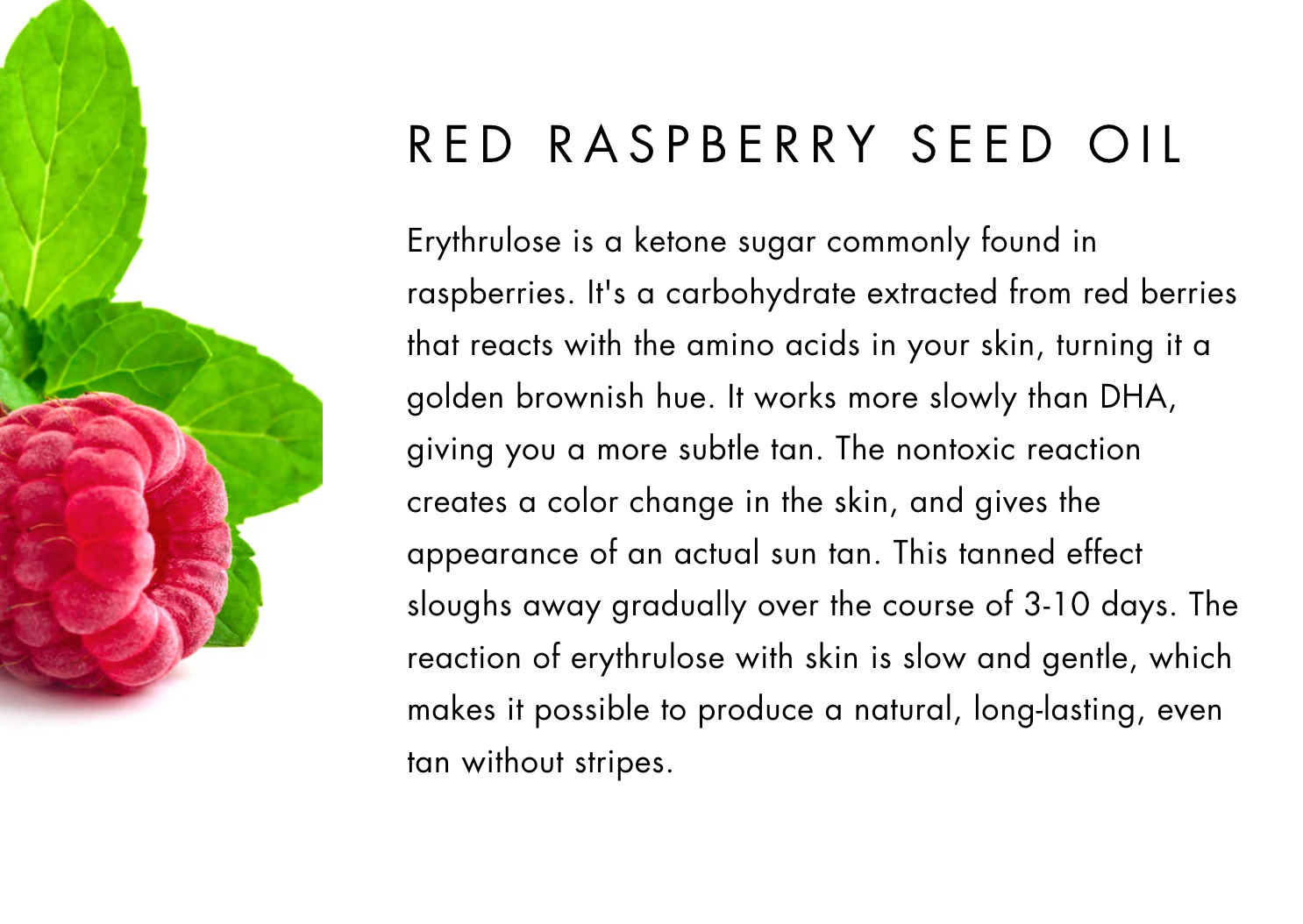 * VEGAN ERYTHRULOSE is a ketone sugar commonly found in raspberries. Erythrulose, like Dihydroxyacetone, reacts with the amino acids in the keratin protein on the outer layer of skin. The nontoxic reaction creates a color change in the skin, similar to a cut apple exposed to oxygen, and gives the appearance of an actual sun tan. This tanned effect sloughs away gradually over the course of 3-10 days.