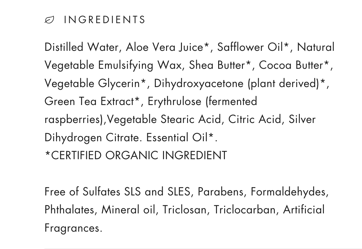DISTILLED WATER, ALOE VERA JUICE*, SAFFLOWER OIL*, NATURAL VEGETABLE EMULSIFYING WAX, SHEA BUTTER*, COCOA BUTTER*, VEGETABLE GLYCERIN*, ERYTHRULOSE (PLANT DERIVED),VEGETABLE STEARIC ACID, CITRIC ACID, SILVER DIHYDROGEN CITRATE, ESSENTIAL OIL*.