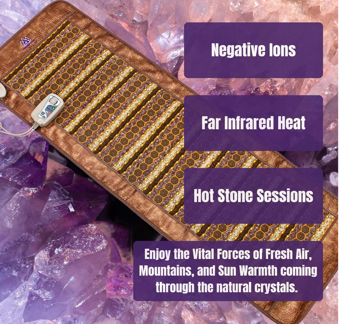 - With the MediCrystal Logo on it, the top of the mat is not a heated area, but this and other non-heated areas of the mat still have anion layers to generate negative ions.