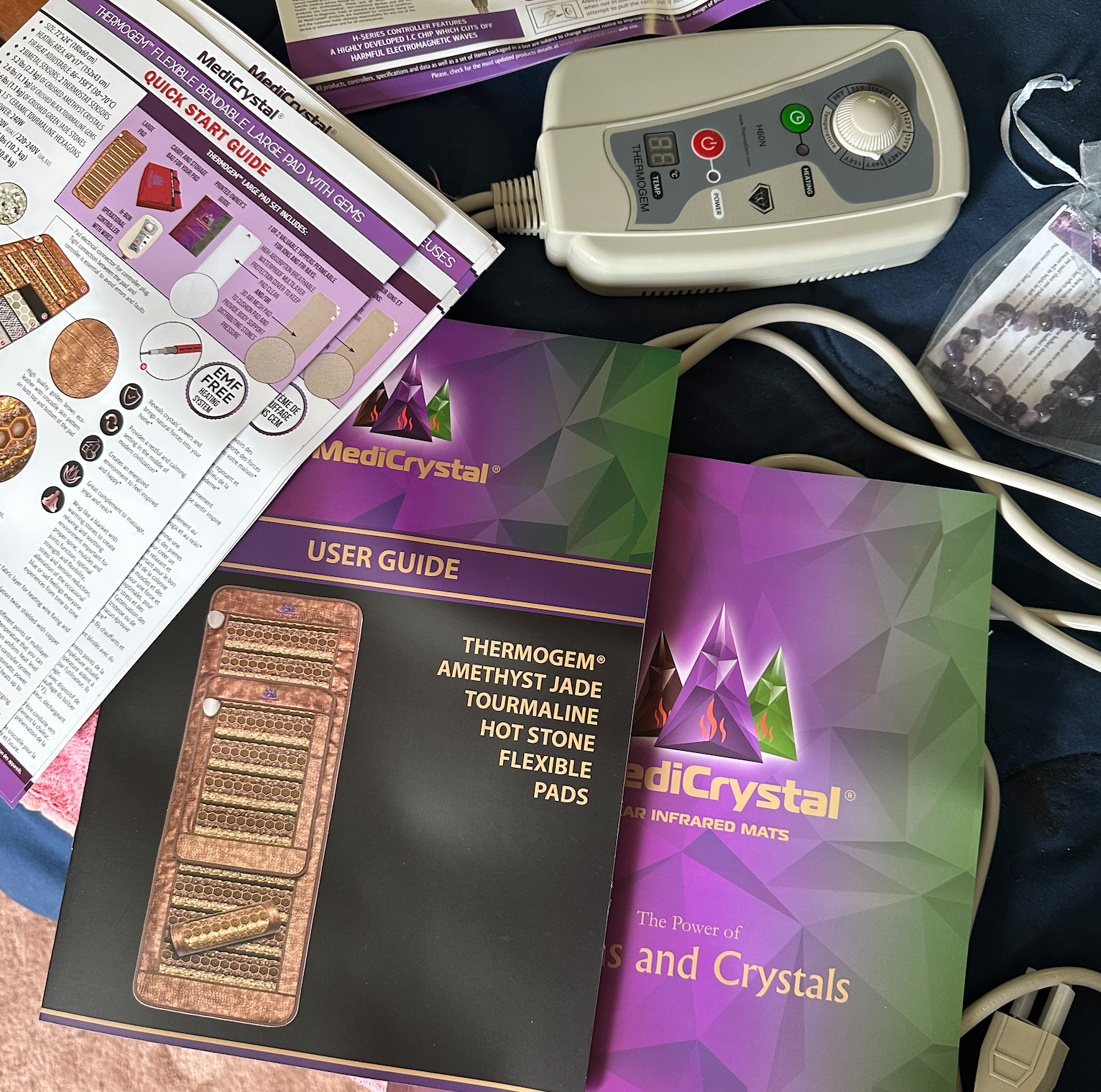 - When you get the box with your mat, if it is too cold or too hot or wet outside, please keep the mat inside for an hour to adjust to room temperature before connecting to the power socket. Open the box and take out the mat carefully, especially if it is a large size mat. It may be too heavy, and you may need someone’s help. Check that all accessories are included. Put the mat on the floor, bed, or another flat surface with the side of the crystal facing up.